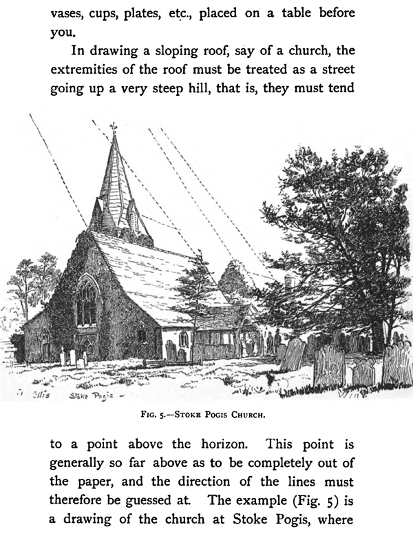 In drawing a sloping roof, say of a church, the extremities of the roof must be treated as a street going up a very steep hill, that is, they must tend to a point above the horizon. This point is generally so far above as to be completely out of the paper, and the direction of the lines must therefore be guessed at. The example (Fig. 5) is a drawing of the church at Stoke Pogis, where Gray was supposed to have written his celebrated Elegy. The smaller roof behind is in a different plane to the larger one, and has a different slope, so the lines and edges of its extremities go to a different point than those of the other. To give the rules for finding all these points would expand the size of this book beyond its limits, besides being puzzling to those not initiated in mathematics. The points must therefore be guessed by eye. It is generally sufficient to make the lines at the two ends nearly, but not quite, parallel, and sloping towards each other a little at the top.