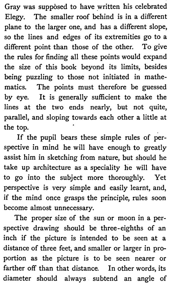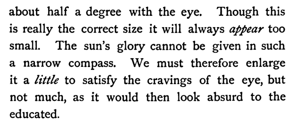 The proper size of the sun or moon in a perspective drawing should be three-eighths of an inch if the picture is intended to be seen at a distance of three feet, and smaller or larger in proportion as the picture is to be seen nearer or farther off than that distance. In other words, its diameter should always subtend an angle of about half a degree with the eye. Though this is really the correct size it will always appear too small. The sun's glory cannot be given in such a narrow compass. We must therefore enlarge it a little to satisfy the cravings of the eye, but not much, as it would then look absurd to the educated.