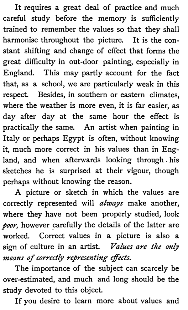 It requires a great deal of practice and much careful study before the memory is sufficiently trained to remember the values so that they shall harmonise throughout the picture. It is the constant shifting and change of effect that forms the great difficulty in out-door painting, especially in England. This may partly account for the fact that, as a school, we are particularly weak in this respect. Besides, in southern or eastern climates, where the weather is more even, it is far easier, as day after day at the same hour the effect is practically the same. An artist when painting in Italy or perhaps Egypt is often, without knowing it, much more correct in his values than in England, and when afterwards looking through his sketches he is surprised at their vigour, though perhaps without knowing the reason.