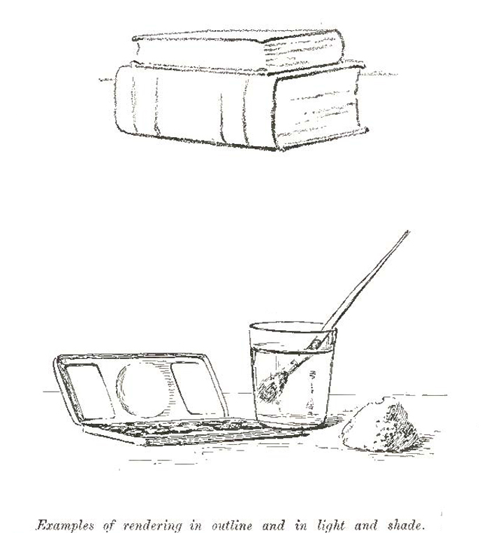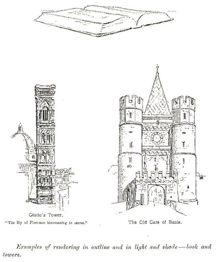 TYPES OF FORMS AND SHAPES AND DRAWING SIMPLE OBJECTS FROM THEM Types of form.a. The following type solids :Sphere, hemisphere, ovoid, spheroid (prolate and oblate), cylinder, circular plinth, and cone. NOTE. - The type solids given above are to be considered in two groups, one with the sphere as a central type, the other with the cylinder as a central type. Relative dimensions are shown by diameters, etc., in each group. Ovoid. NOTE. - The first thre.e type solids given above and the square pyramid form a group with the square prism as a central tape. The first four may be classed as prisms. The vase is a compound form. Objects resembling types of form. b. Objects resembling a sphere and spheroids, as an apple, a peach, a turnip. Although no statement is made concerning groups of objects in the Syllabus for Elementary Drawing, the Department of Regents gives such drawings in the examination for the First Year Academic Certificate. Examples of object drawing. Examples of drawings of single objects, groups of objects, leaves, sprays,. etc., will be found in the following pages. These drawings have been selected to illustrate the choice of objects through which both the interest of the pupils and their appreciation of the laws of perspective and the value of good drawing and good rendering may be secured. They have also been selected with a view to the possibilities of schoolrooms in the way of providing materials for such drawings, either within the room or from the windows. The Gate of Basle and Giotto's Tower are chosen as examples of historic architectural detail well worth copying both for the sake of association and-for their architectural value. Longfellow's description of the latter adds to the appreciation gained by the study of the picture. Examples of rendering simple objects based on the type forms, singly and grouped. |