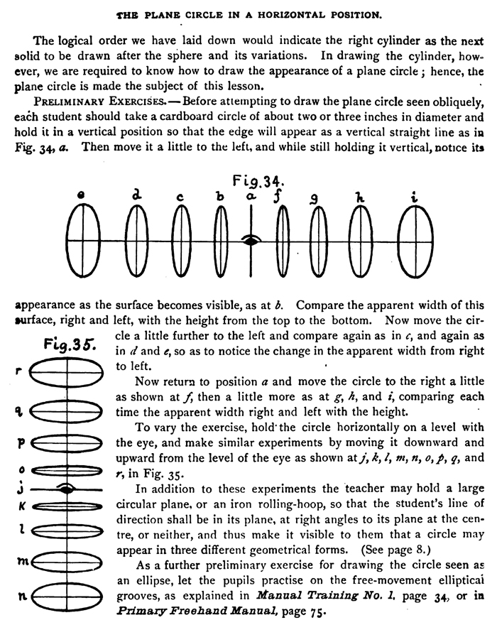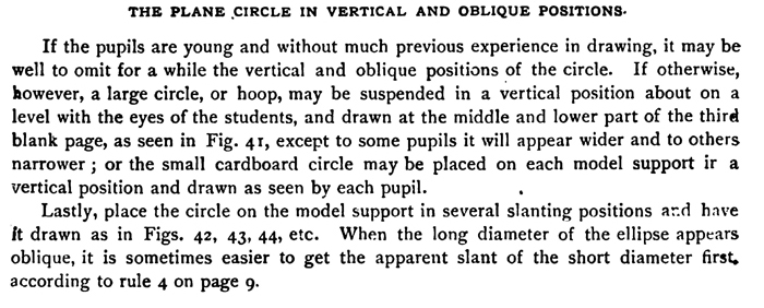 In addition to these experiments the teacher may hold a large circular plane, or an iron rolling-hoop, so that the student's line of direction shall be in its plane, at right angles to its plane at the centre, or neither, and thus make it visible to them that a circle may appear in three different geometrical forms.