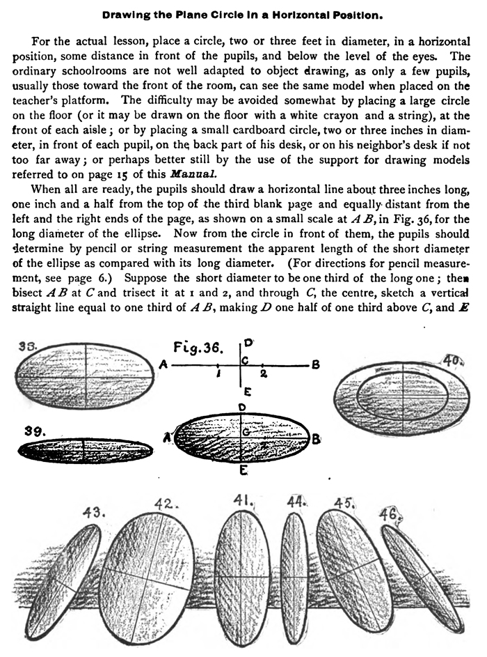 For the actual lesson, place a circle, two or three feet in diameter, in a horizontal position, some distance in front of the pupils, and below the level of the eyes. The ordinary schoolrooms are not well adapted to object drawing, as only a few pupils, usually those toward the front of the room, can see the same model when placed on the teacher's platform. The difficulty may be avoided somewhat by placing a large circle on the floor (or it may be drawn on the floor with a white crayon and a string), at the front of each aisle ; or by placing a small cardboard circle, two or three inches in diameter, in front of each pupil, on the back part of his desk, or on his neighbor's desk if not too far away ; or perhaps better still by the use of the support for drawing models..