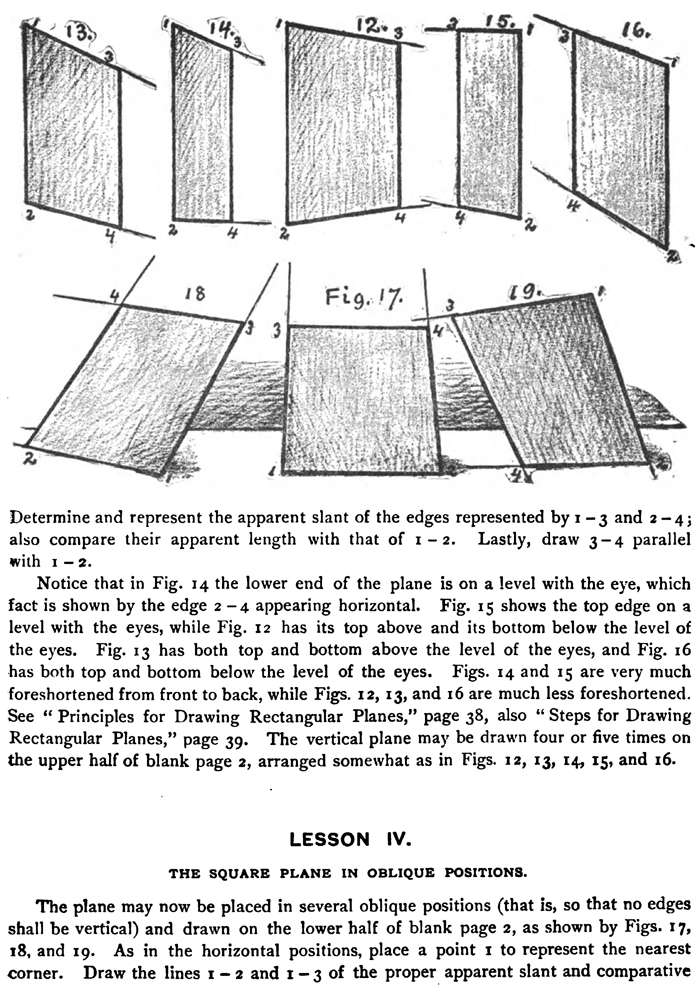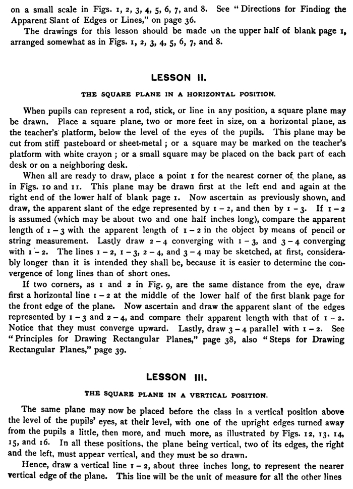 [The Text Above is Saves as Images, if you need to copy some text, it is below] THE STRAIGHT STICK OR EDGE.The blank pages numbered from 1 to 12 are to be used in drawing the regular exercises of this book. Besides these there are four blank pages not numbered, which are to be used for examinations, free movement exercises, or home work, as the teacher may direct. For the first practical lesson place a straight slender stick or iron rod before the class. It may be placed on the teacher's platform, or leaned against the wall or the desk, or placed anywhere in full view of the class. If it is not convenient to obtain a stick, draw straight lines on the platform in different positions with white crayon. The lesson is to draw or represent by a line of convenient length, say two or three inches long, the apparent slant of the stick or edge, in many different positions. The drawings for this lesson should be made un the upper half of blank page 1, arranged somewhat as in Figs. 1, 2, 3, 4, 5, 6, 7, and 8. THE SQUARE PLANE IN A HORIZONTAL POSITION.When pupils can represent a rod, stick, or line in any position, a square plane may be drawn. Place a square plane, two or more feet in size, on a horizontal plane, as the teacher's platform, below the level of the eyes of the pupils. This plane may be cut from stiff pasteboard or sheet-metal; or a square may be marked on the teacher's platform with white crayon; or a small square may be placed on the back part of each desk or on a neighboring desk. When all are ready to draw, place a point I for the nearest corner of, the plane, as in Figs. 10 and 11. This plane may be drawn first at the left end and again at the right end of the lower half of blank page 1. Now ascertain as previously shown, and draw, the apparent slant of the edge represented by 1 - 2, and then by 1 - 3. If 1 - 2 is assumed (which may be about two and one half inches long), compare the apparent length of 1 - 3 with the apparent length of 1 - 2 in the object by means of pencil or string measurement. Lastly draw 2 -4 converging with 1 - 3, and 3-4 converging with 1- 2. The lines 1 - 2, 1 - 3, 2 - 4, and 3 - 4 may be sketched, at first, considerably longer than it is intended they shall be, because it is easier to determine the convergence of long lines than of short ones. If two corners, as 1 and 2 in Fig. 9, are the same distance from the eye, draw first a horizontal line 1 - 2 at the middle of the lower half of the first blank page for the front edge of the plane. Now ascertain and draw the apparent slant of the edges represented by I - 3 and 2 - 4, and compare their apparent length with that of 1 - 2. Notice that they must converge upward. Lastly, draw 3 - 4 parallel with 1- 2. THE SQUARE PLANE IN A VERTICAL POSITION.The same plane may now be placed before the class in a vertical position above the level of the pupils' eyes, at their level, with one of the upright edges turned away from the pupils a little, then more, and much more, as illustrated by Figs. 12, 13, 14, 15, and 16. In all these positions, the plane being vertical, two of its edges, the right and the left, must appear vertical, and they must be so drawn. Hence, draw a vertical line 1 - 2, about three inches long, to represent the nearer vertical edge of the plane. This line will be the unit of measure for all the other lines. Determine and represent the apparent slant of the edges represented by x —3 and 2 —4; also compare their apparent length with that of 1 — 2. Lastly, draw 3-4 parallel with 1 — 2. Notice that in Fig. 14 the lower end of the plane is on a level with the eye, which fact is shown by the edge 2 -4 appearing horizontal. Fig. 15 shows the top edge on a level with the eyes, while Fig. 12 has its top above and its bottom below the level of the eyes. Fig. 13 has both top and bottom above the level of the eyes, and Fig. 16 has both top and bottom below the level of the eyes. Figs. 14 and 15 are very much foreshortened from front to back, while Figs. 12, 13, and 16 are much less foreshortened. The vertical plane may be drawn four or five times on the upper half of blank page 2, arranged somewhat as in Figs. 12, 13, 14, 15, and 16. THE SQUARE PLANE IN OBLIQUE POSITIONS.The plane may now be placed in several oblique positions (that is, so that no edges shall be vertical) and drawn on the lower half of blank page 2, as shown by Figs. 17, 18, and 19. As in the horizontal positions, place a point 1 to represent the nearest corner. Draw the lines 1 — 2 and x —3 of the proper apparent slant and comparative length. Draw 3 - 4 and 2 - 4 of their proper apparent slant, and their intersection 4 will be the fourth corner. In Fig. 18 the top of the plane leans from the spectator and toward the right; in Fig. 17 the top is leaning backward, or from the spectator ; in Fig. 19 the top is leaning forward and toward the left.