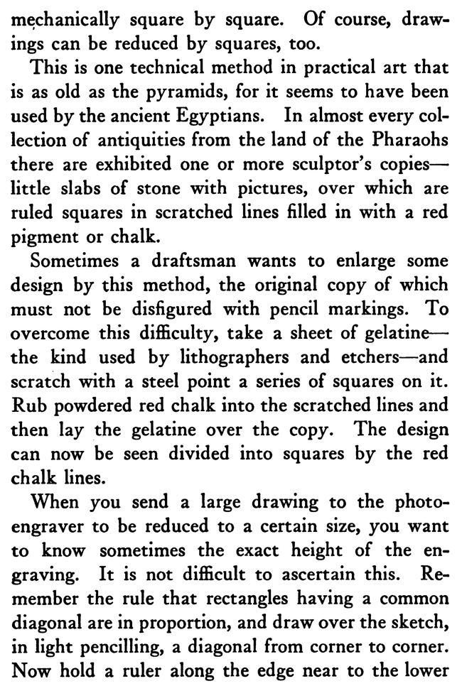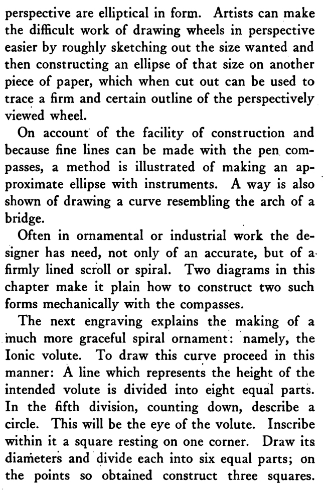 The above text is actually made up of images...to copy any text, you can find it below. HELPFUL GEOMETRY FOR ARTISTSArtists, illustrators, and designers rarely need to be skilled in mechanical drawing nor to have any special scholarship as geometricians. A knowledge of a few simple problems in plane geometry, however, can often be advantageously turned to account in certain classes of their work. The sure methods of geometry are much better than guesswork in the construction of regular plane figures, ellipses, etc., to say nothing of saving both time and labor. Take, for instance, the dividing of a line into a certain number of parts. The first diagram of this chapter shows how to do this. You will need a straight-edge and a triangle. A scale marked off into centimetres and millimetres is also available, as it is very easy to calculate the divisions with it. You can also use a T-square with a shifting head adjusted so as to run the parallel oblique lines. It is necessary that the edge of the drawing-board be absolutely straight in drawing parallel lines with the T-square. The method, as shown in the diagram, of marking off the radius of a circle on its circumference and getting six points on which to construct a hexagon, can be used in drawing the network of lines for the groundwork of a repeat pattern. Make the circle in the middle of the paper and find the six equidistant points, then through the centre of the circle and the six points draw the two sets of parallel lines as shown in the diagram. By using the points and lines so obtained and the degree of obliquity of these lines, the whole surface of the paper can be covered with a foundation on which either ornamental or floral repeat patterns can be designed. Frequently a designer wishes to draw a polygon with an equal number of sides. It is an easy matter, as we have seen, to construct a polygon of six equal as centers describe arcs D will bisect intersecting in C anaD AB in. E sides, but when it comes to marking an uneven sided polygon, there is a difficulty of dividing the circle—if a circle is taken as a start—into the required number of equal parts. The diagram on page 1o8 in this chapter shows how to make a pentagon inscribed within a circle, and then if you wish with the same points a pentacle or five-pointed star. Any regular polygon can be made by the aid of a circle. Divide the diameter of the circle equally into the same number of parts as there are sides to the required polygon. Now from the ends of the diameter, as centres, describe arcs with radii equal to the diameter, and intersecting at a point outside of the circle. Then from this point, where the two arcs intersect, draw a line through the second of the divisions on the diameter to and intersecting the circumference of the circle. Here from this point to the nearest end of the diameter, you now have one side of the required polygon. This is the most practical method of dividing circles or inscribing within them regular polygons when the required number of sides is an odd number like 7, 9, or i 1. It is important to remember that it is always the second division on the diameter through which the line from the point outside the circle is drawn. When designers have need of oval or elliptical forms or parts of such forms, they will find the way through the major axis and one through the minor axis, into four equal parts; whereas an oval can be divided into equal parts bilaterally only; that is, by a line through the long axis. Special instruments have been invented to outline ellipses; ordinarily, though, an artist can make the method do that is shown here of using pins and thread. The shadow of a circle under certain conditions, the section of a cone cut obliquely, and a circle in perspective are elliptical in form. Artists can make the difficult work of drawing wheels in perspective easier by roughly sketching out the size wanted and then constructing an ellipse of that size on another piece of paper, which when cut out can be used to trace a firm and certain outline of the perspectively viewed wheel. On account of the facility of construction and because fine lines can be made with the pen compasses, a method is illustrated of making an approximate ellipse with instruments. A way is also shown of drawing a curve resembling the arch of a bridge. Often in ornamental or industrial work the designer has need, not only of an accurate, but of a. firmly lined scroll or spiral. Two diagrams in this chapter make it plain how to construct two such forms mechanically with the compasses. The next engraving explains the making of a much more graceful spiral ornament : namely, the Ionic volute. To draw this curve proceed in this manner: A line which represents the height of the intended volute is divided into eight equal parts. In the fifth division, counting down, describe a circle. This will be the eye of the volute. Inscribe within it. a square resting on one corner. Draw its diameters and divide each into six equal parts; on the points so obtained construct three squares. smaller as required. The sides of the little squares, if extended in lightly drawn construction lines, mark limits of quadrants and show where they join each other. An intricate design or a small sketch can be enlarged by ruling it off into a number of small squares and then ruling the larger area with the same number of, but larger, squares. The drawing is then copied mechanically square by square. Of course, drawings can be reduced by squares, too. This is one technical method in practical art that is as old as the pyramids, for it seems to have been used by the ancient Egyptians. In almost every collection of antiquities from the land of the Pharaohs there are exhibited one or more sculptor's copies—little slabs of stone with pictures, over which are ruled squares in scratched lines filled in with a red pigment or chalk. Sometimes a draftsman wants to enlarge some design by this method, the original